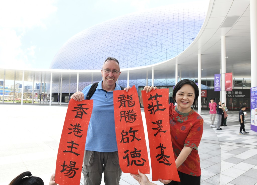 John Sharkey, CEO of Kai Tak Sports Park, also immersed himself in the celebrations, receiving a custom calligraphy piece with his full Chinese name, along with a panda paper-cut and flour doll from stall owners during his visit.