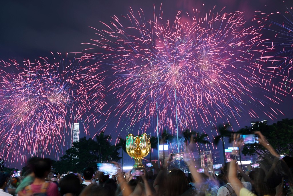 More than 340,000 spectators gathered along both sides of Victoria Harbour to glimpse the 23-minute National Day fireworks display on Wednesday night, which featured eight scenes including space themes and giant pandas.