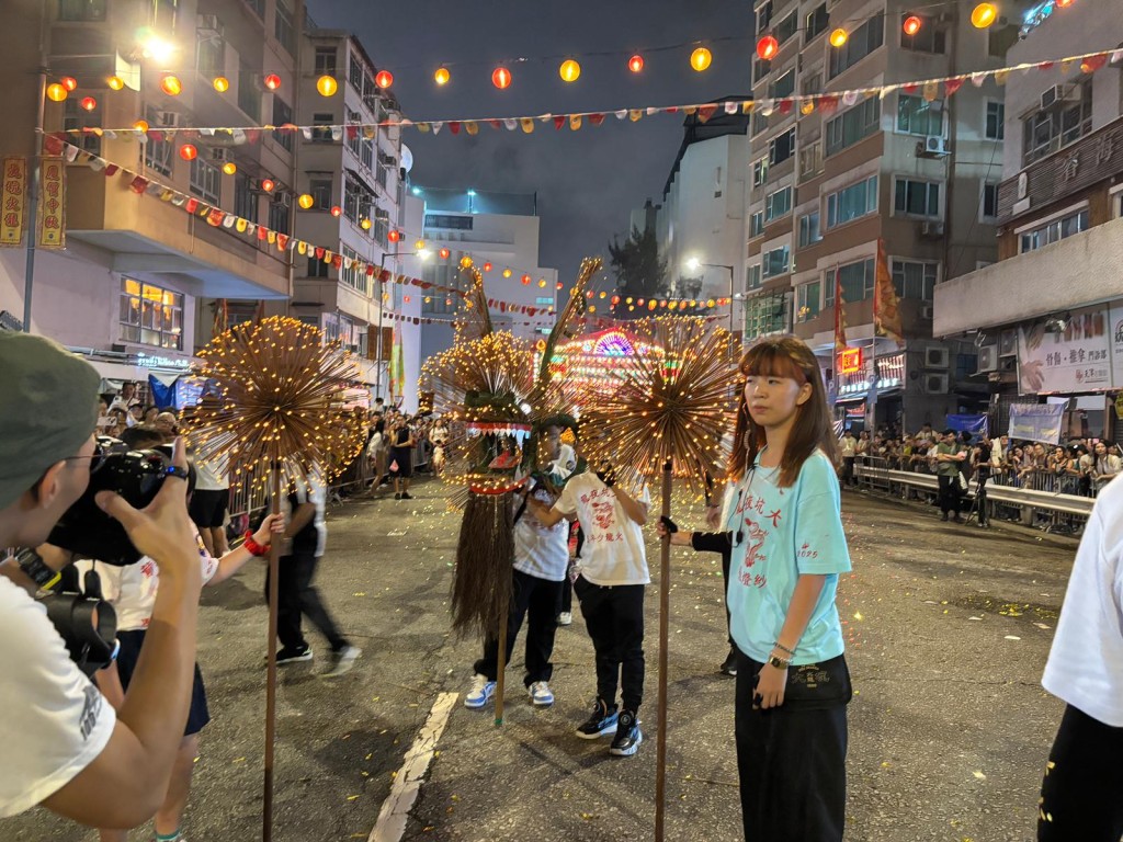 A small dragon with LED lights was also danced by children, while crowd control barriers and related signage were set up in the surrounding streets of Tai Hang.