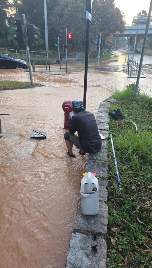 At around 7am today, a major water pipe along San Wan Road near So Kwun Po Road suddenly ruptured. Large amounts of yellow muddy water flooded nearby roads, with depths reaching over 10 centimeters at times.