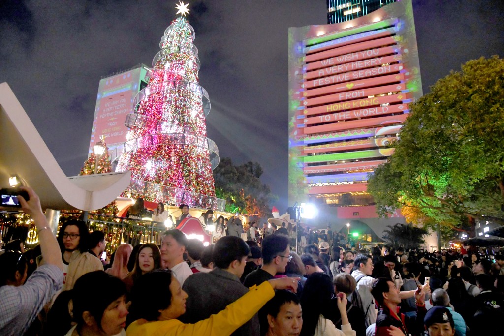 A 20-meter-tall Christmas tree and a 3D projection show attracted crowds to the "Winter Wonderland in Central" at Statue Square on Christmas Eve.