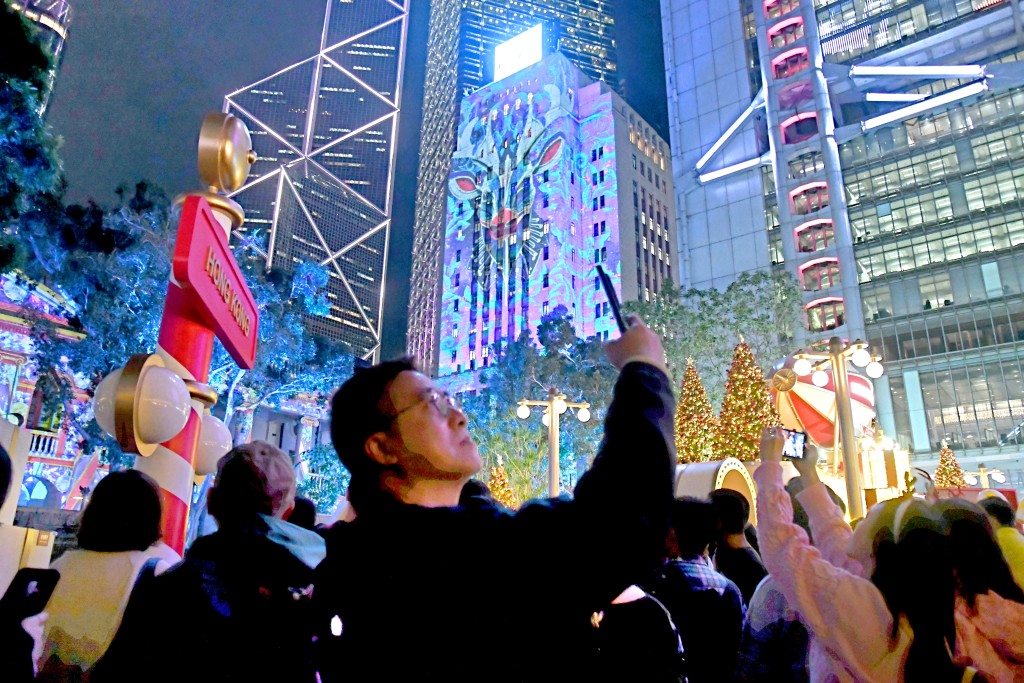 Residents and tourists gathered near the tree and around the square from 6pm onward to watch the "Immersive Light Show in Central" projection show, which began at 7pm on landmark buildings including the Court of Final Appeal, the Bank of China Tower and the Hong Kong Club Building.