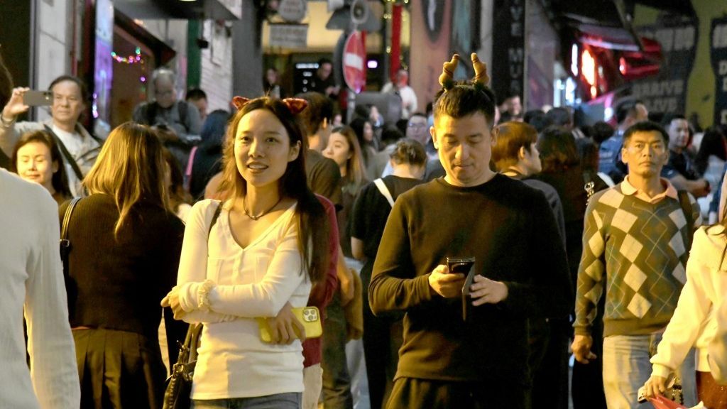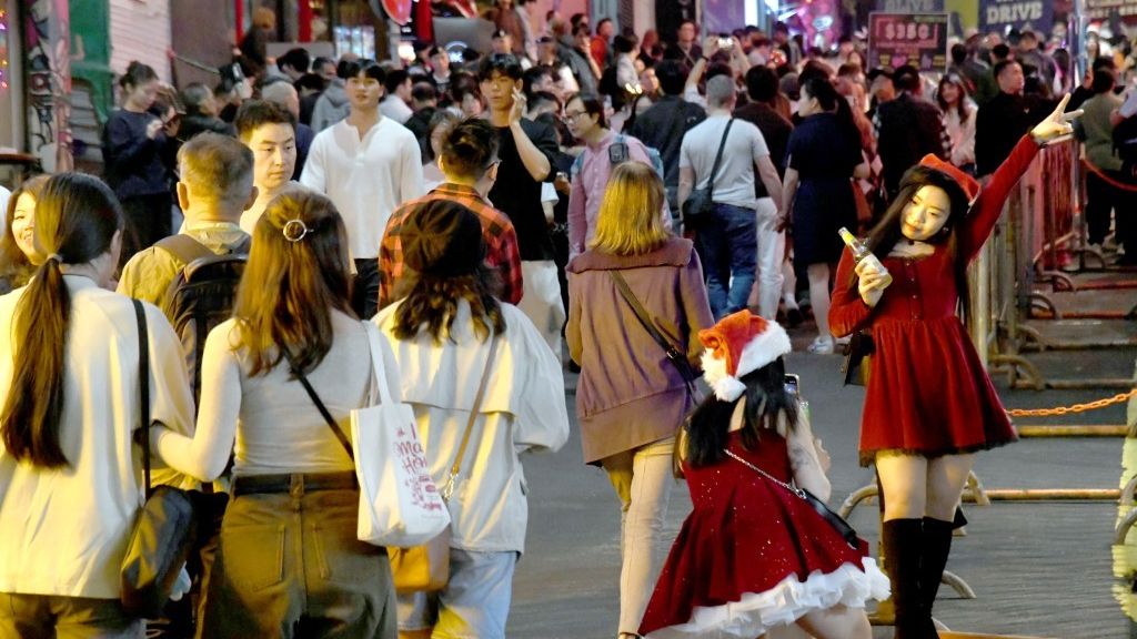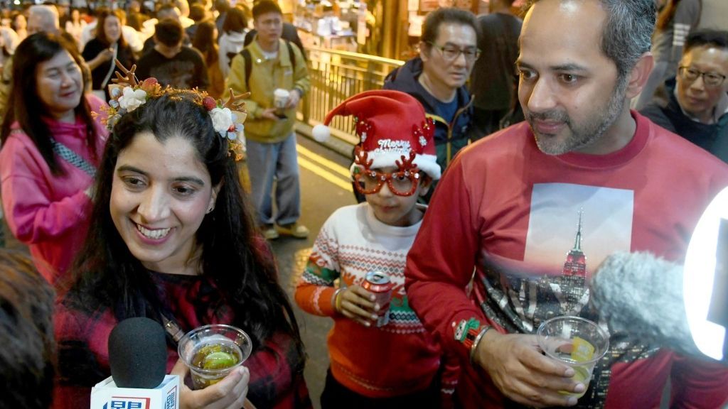 Lan Kwai Fong drew crowds on Christmas Eve, with visitors praising its festive atmosphere and an industry association forecasting a five to 10 percent rise in footfall and a five percent increase in spending compared to last year.