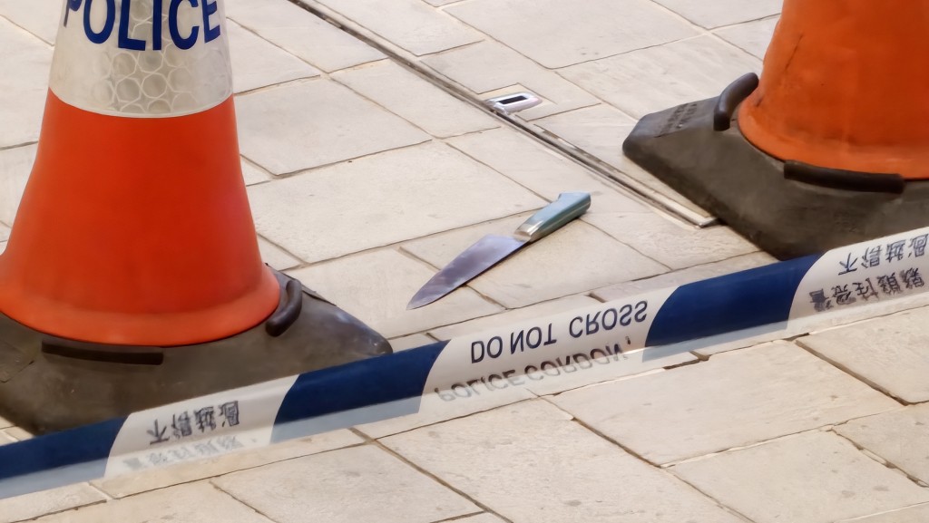 Police received a report at 7.10pm that a suspicious man took a knife from a Donki food stall at the plaza. He was later seen on Tuen Wui Street waving a 12-inch knife as people fled. An officer fired a pepper spray round but it was ineffective.
