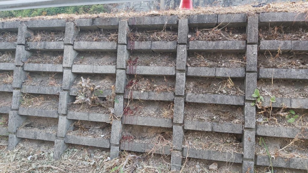 Police investigators examined the scene, where blood stained the grass and dripped onto the retaining wall below.