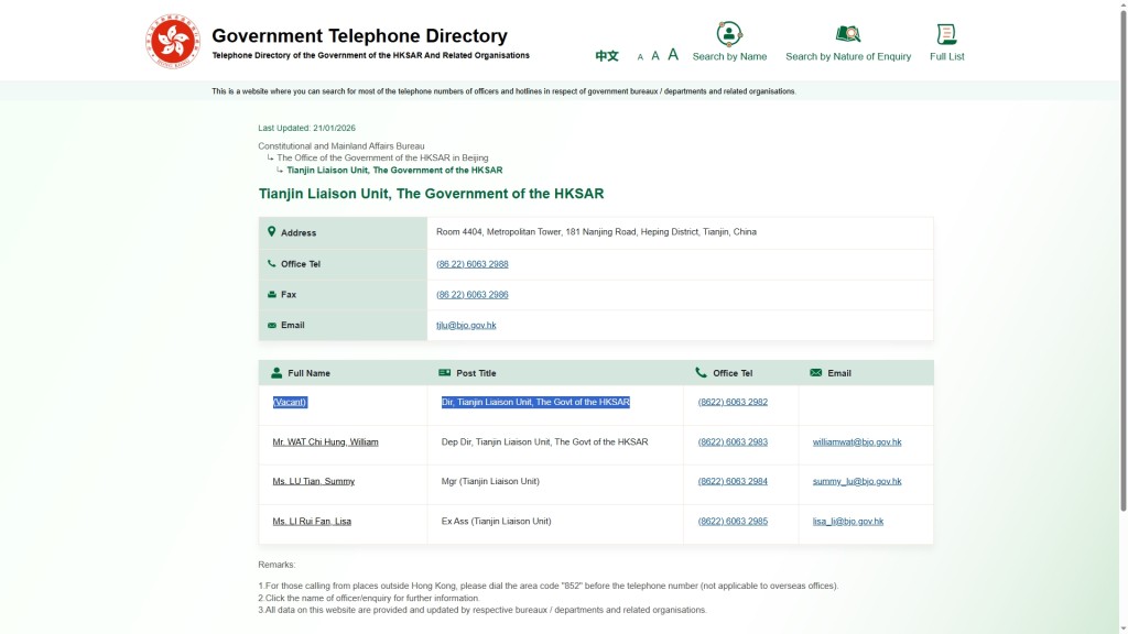 The government directory listed the Tianjin Liaison Unit director post as vacant last night, before the formal announcement.