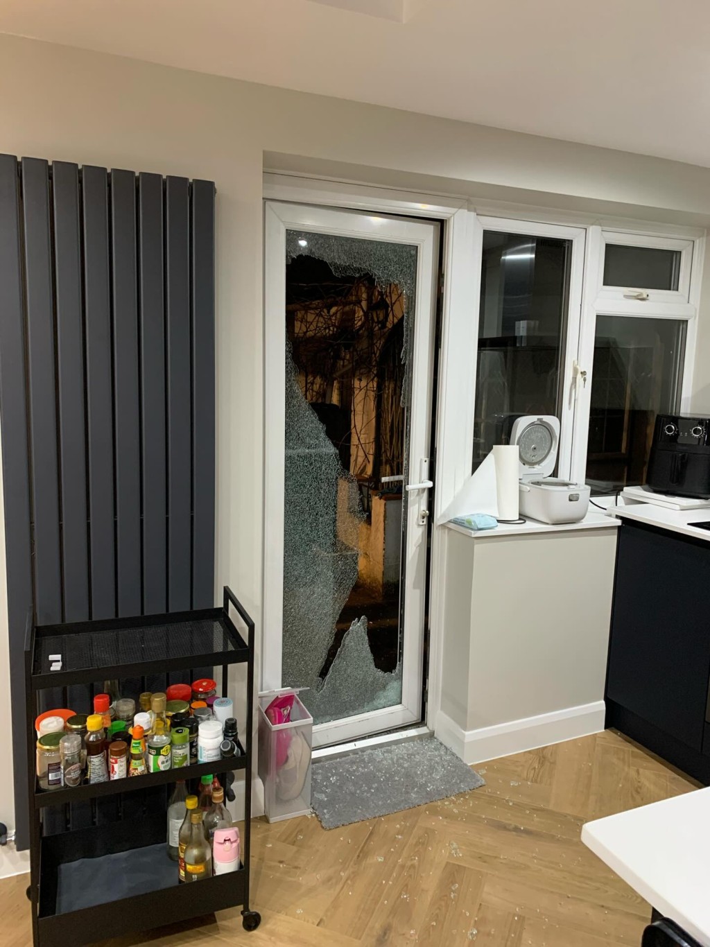 Photos accompanying the post showed a large hole smashed through a glass garden door, with shards scattered across the floor. He initially tried to remain optimistic, but the situation became clear when he went upstairs.