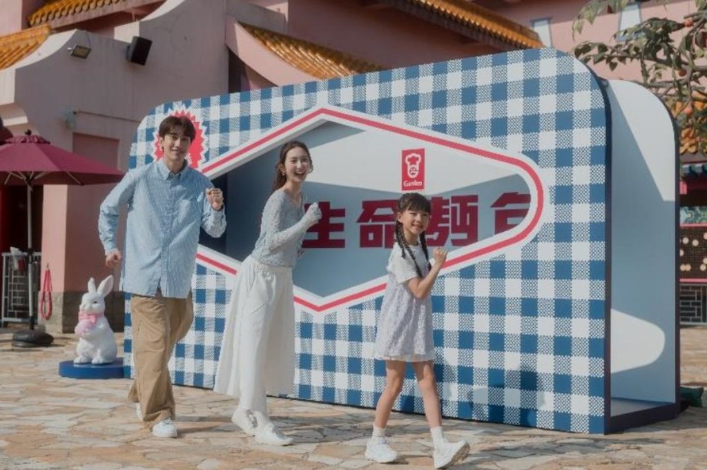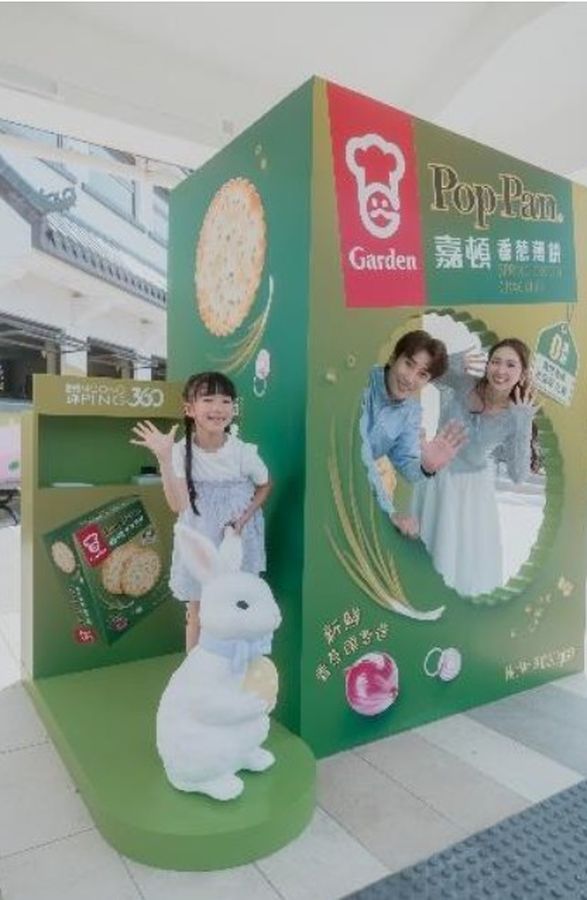Giant photo spots have been set up across Ngong Ping Village, including oversized versions of Garden's classic Pop Pan spring onion crackers in green packaging, the signature red tin of assorted biscuits, and the blue-and-white checkered Life Bread loaf.