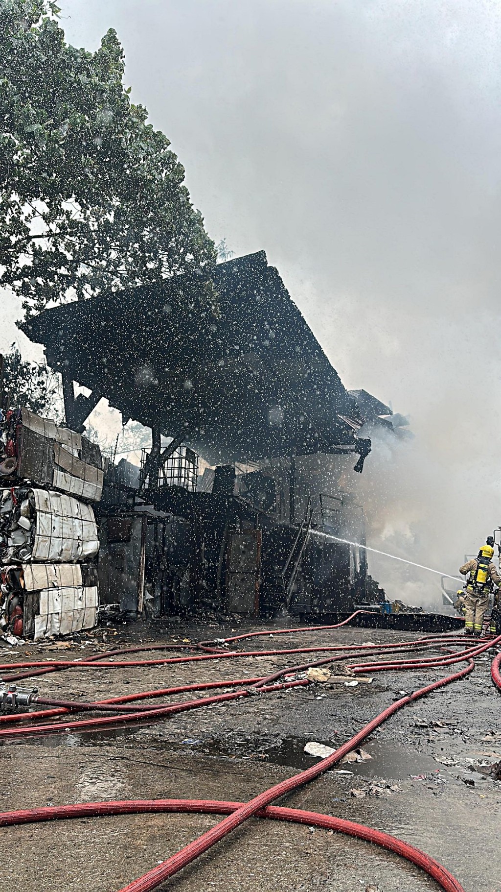 The incident occurred at about 11am at a recycling facility along Ting Kok Road, where flames and thick smoke were seen rising rapidly into the air.