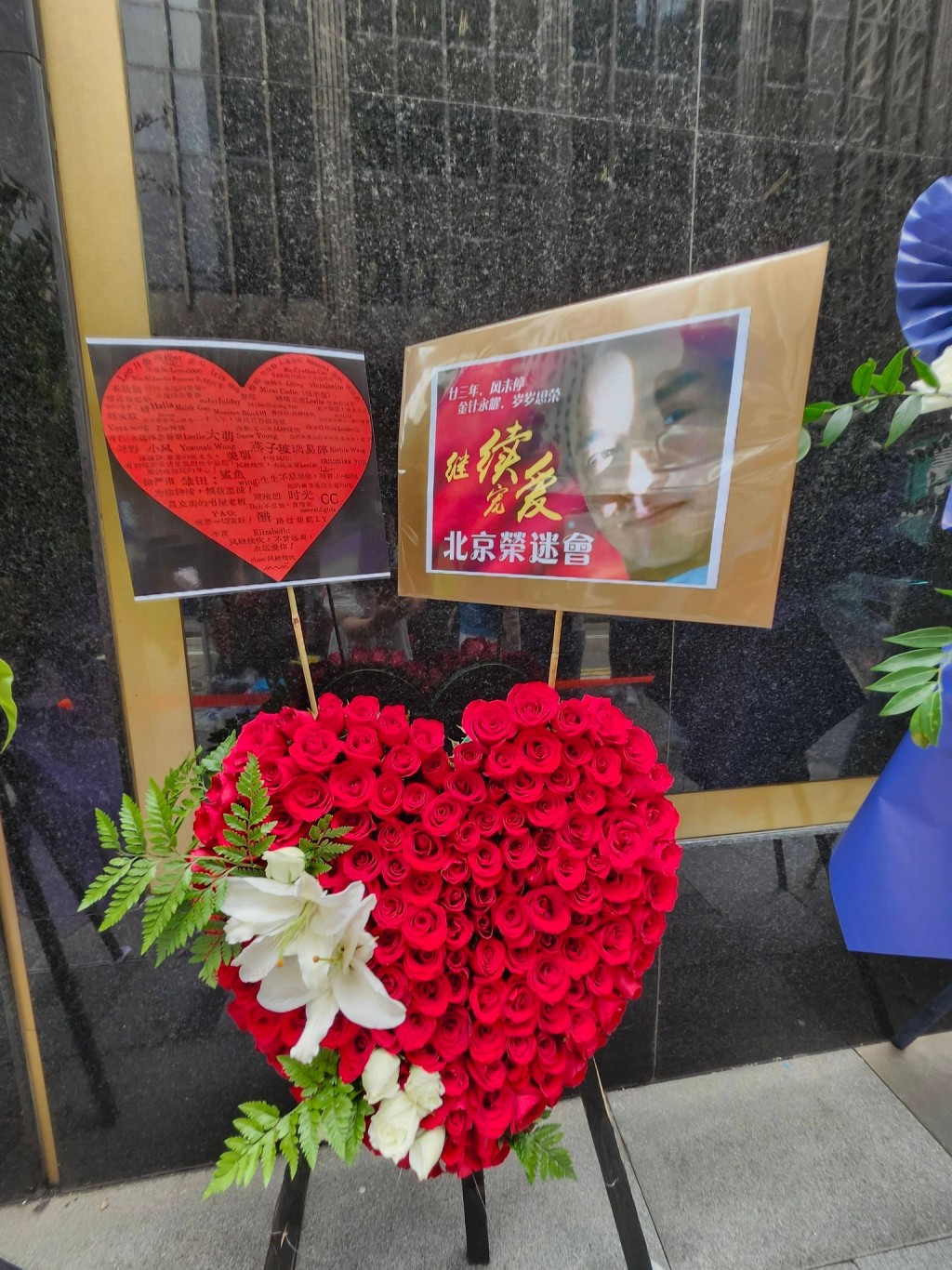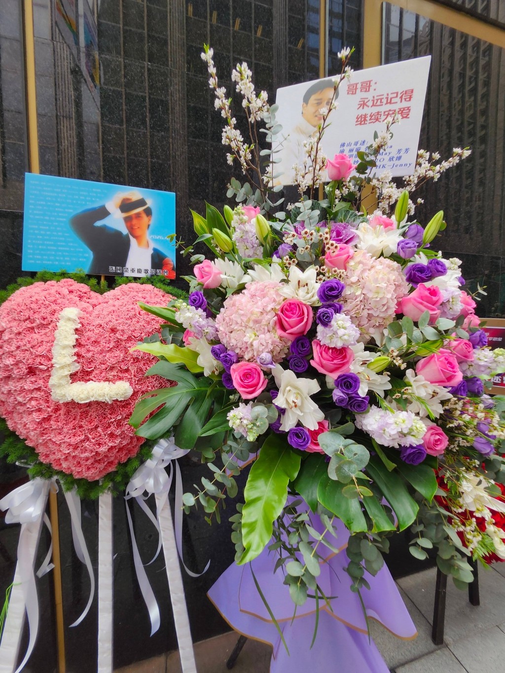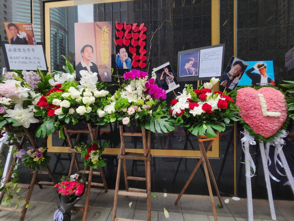 Messages attached to bouquets from fan groups and individuals read “Forever Remembering Leslie Cheung,” “Always Remember, Continue to Cherish,” and “Eternal Adoration for Leslie.”