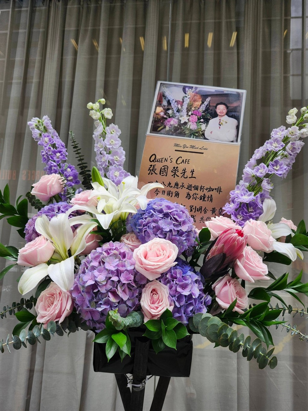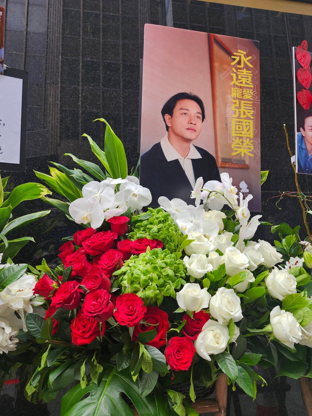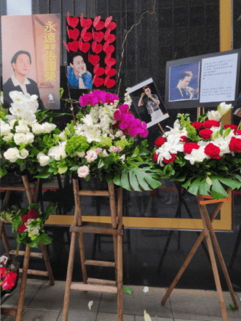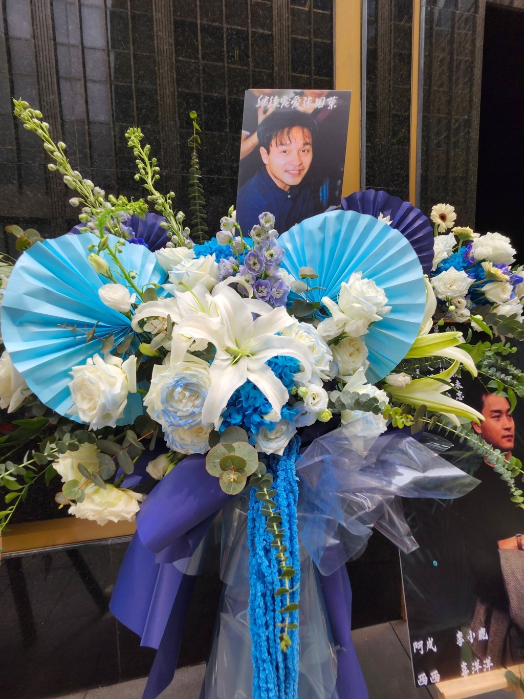 Messages attached to bouquets from fan groups and individuals read “Forever Remembering Leslie Cheung,” “Always Remember, Continue to Cherish,” and “Eternal Adoration for Leslie.”