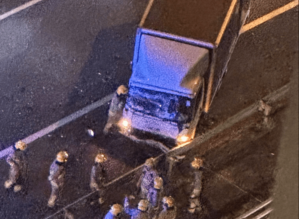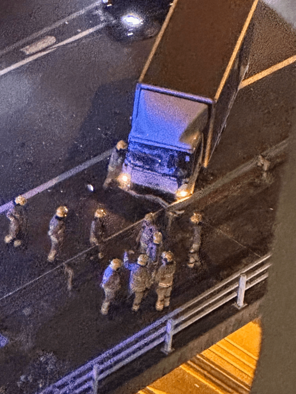 The truck lost control after the impact, crashing into the iron railings on the left side of the road before stopping on the shoulder.