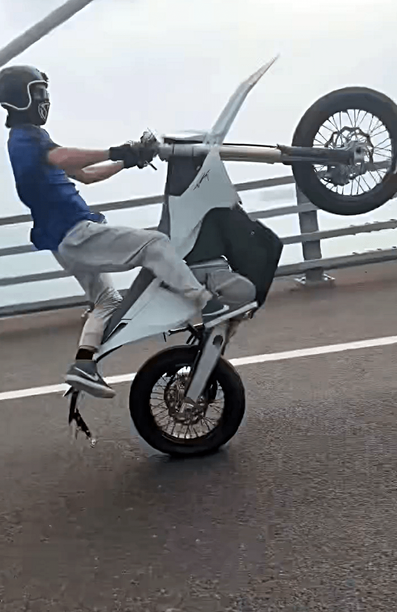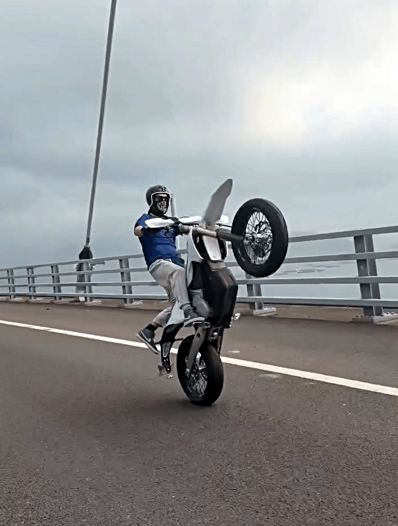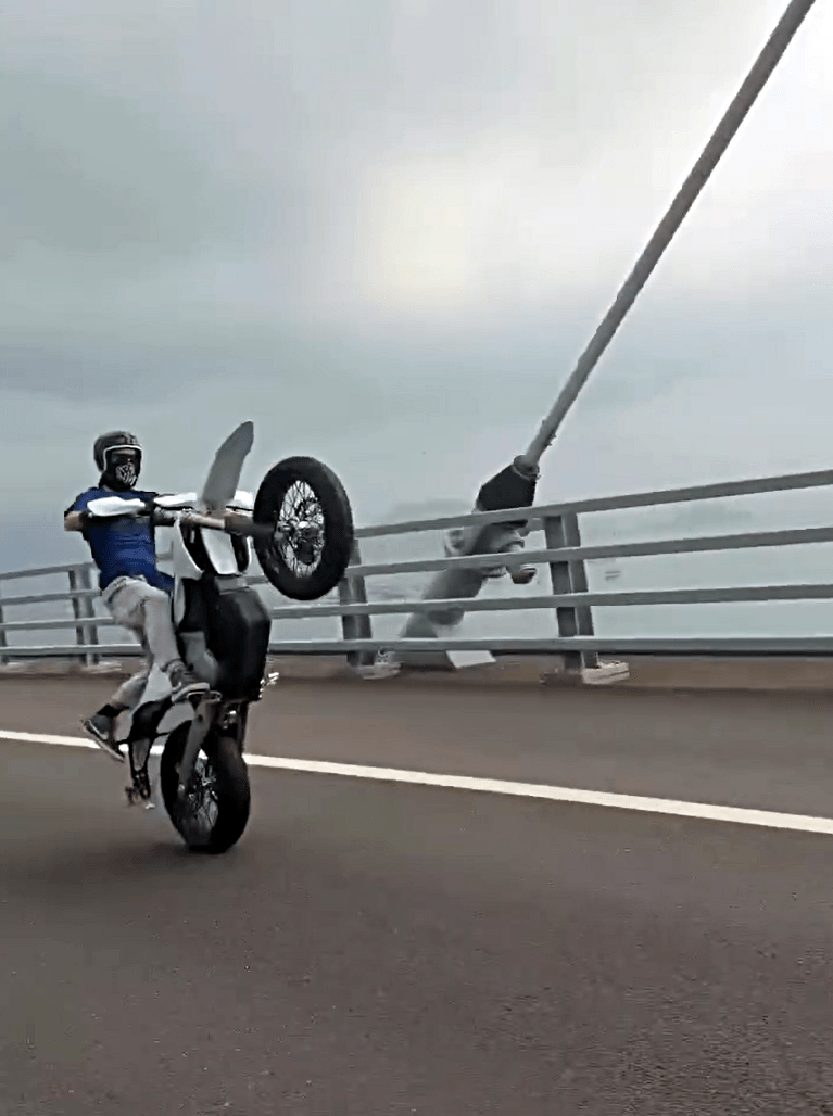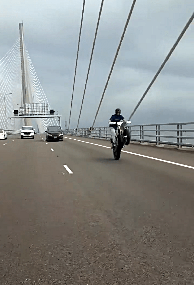 In a video posted on Facebook on Sunday, the motorcyclist, wearing sunglasses and a face covering, was seen performing reckless tricks while being filmed by an accomplice. He first rode the motorcycle on one wheel along the Stonecutters Bridge section of the Tsing Sha Highway, which stands more than 70 meters above the sea.