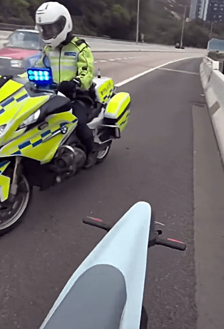 Another segment captured a traffic police officer stopping the man near Kwai Chung Container Terminal on Tsing Yi Road and instructing him to pull onto the road shoulder for inspection. The clip ends as the officer approaches the motorcycle to conduct checks.