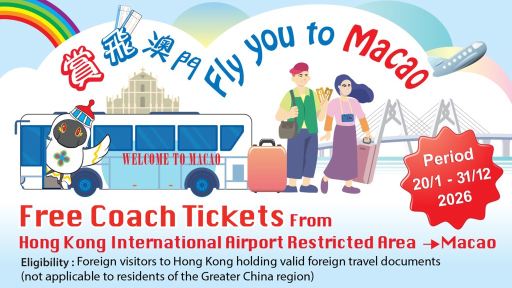 Travelling through Hong Kong on y our way to Asia? Make Macao your next exciting stop with the “Fly you to Macao” promotion. From now to 31 December 2026, eligible international visitors arriving at Hong Kong International Airport (HKIA) can enjoy free coach tickets from the restricted area directly to Macao. Simply present your valid foreign travel document, Hong Kong boarding pass and complete a declaration form at the ticket count at HKIA Transfer Area E2. Your Macao journey is just a comfortable ride away!