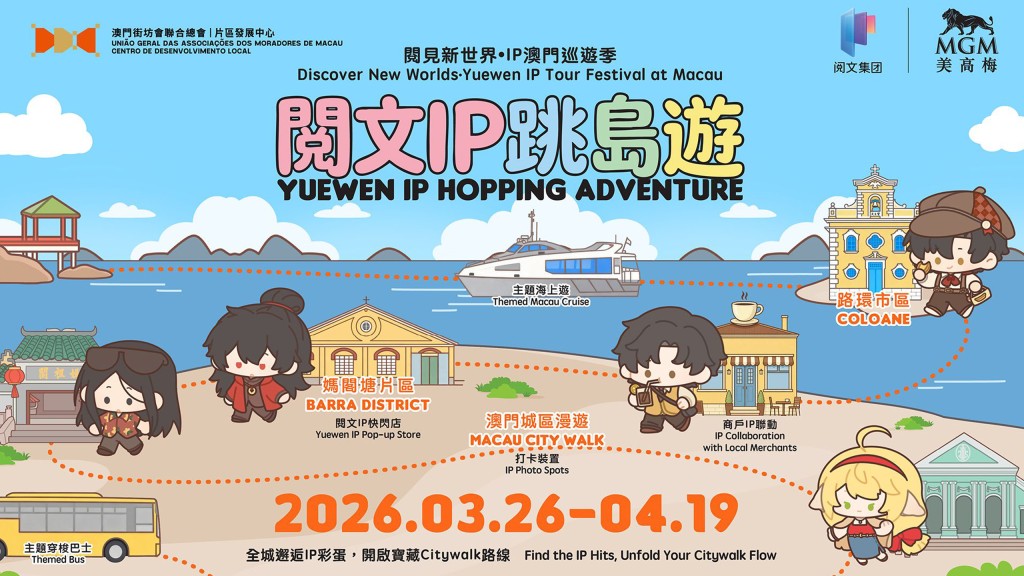 From now until April 19, check out your favourite Yuewen IP characters at “Discover New Worlds • Yuewen IP Tour Festival at Macao”. This extravaganza includes a host of events, starting with the Yuewen IP Hopping Adventure, where you can explore popular IPs at the bustling heart of Macao, the Barra District and its World Heritage sites, and create your own city walk in Macao with your beloved characters.