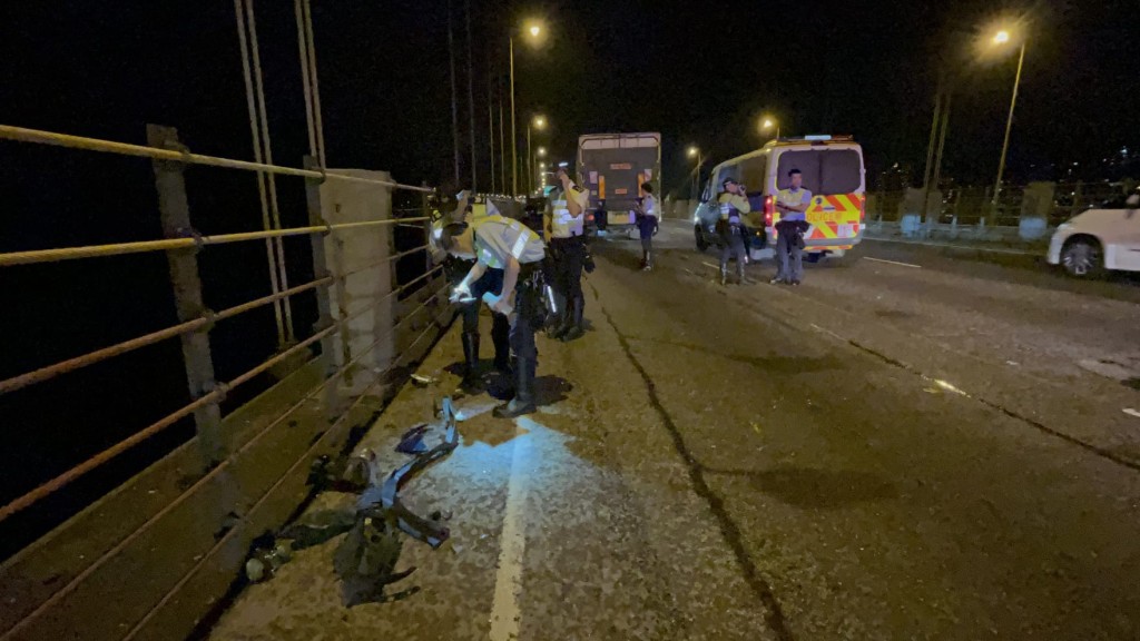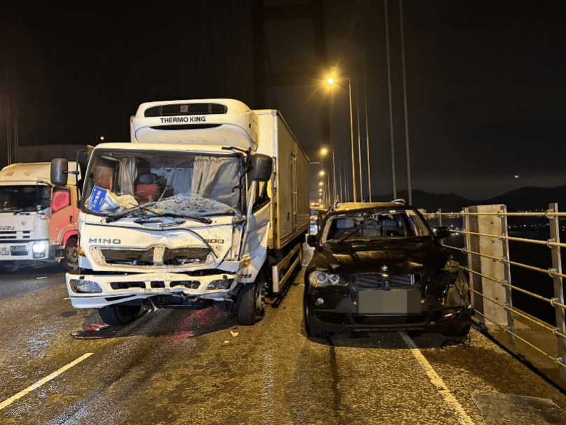 The collision occurred around 10pm yesterday in the airport-bound lanes near Ma Wan, where a BMW had reportedly pulled over due to a punctured front tire.