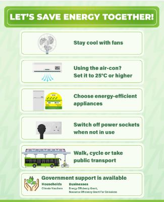 When the Middle East conflict disrupted fuel supplies, Singapore launched the "Go 25" campaign, mandating public sector air-conditioning to be set at 25 degrees Celsius or higher. Meanwhile, agencies were set to switch off non-essential equipment when idle, install LED lighting, and manage air conditioning and lift operation hours. Also, households were advised to air-dry laundry, close curtains to reduce heat indoors, run full washing loads, and take public transport.
