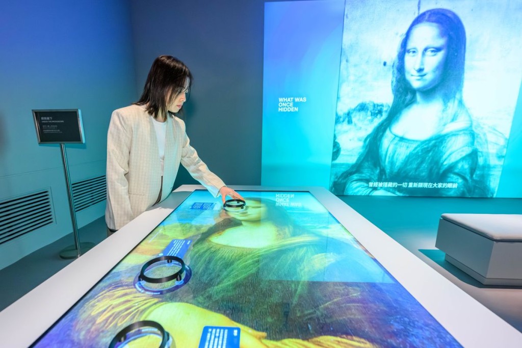 The exhibition features interactive multimedia displays introducing Leonardo da Vinci's painting techniques, playful games, and an immersive photo booth. It also includes three items from the Hong Kong Heritage Museum's collection and paintings by mainland artist Xu Lei, presenting Asian artistic perspectives.