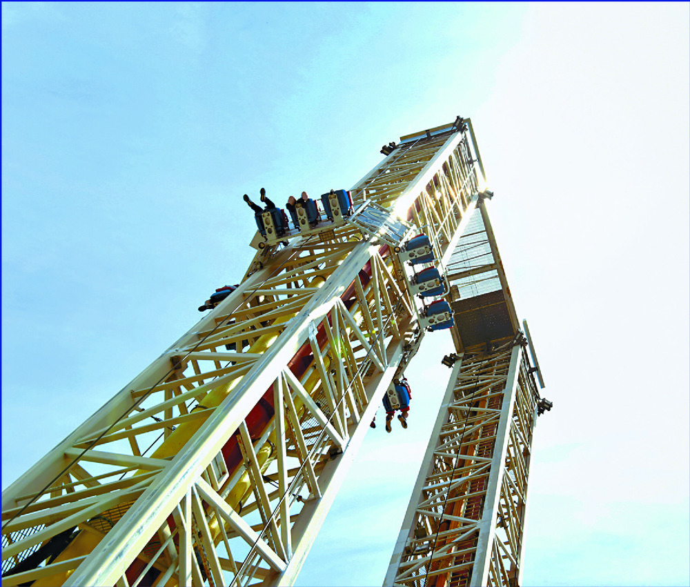 Passengers of the Raging River sit in a log-shaped boat, which meanders along narrow channels and then plunges in a vertical drop at a speed of 58 kilometers per hour.