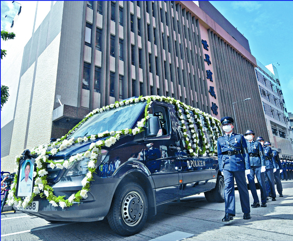 Carrie Lam Cheng Yuet-ngor attended the full-honor traditional and police force ceremonies along with Financial Secretary Paul Chan Mo-po, Secretary for Security Chris Tang Ping-keung and Commissioner of Police Raymond Siu Chak-yee at Universal Funeral Parlour in Hung Hom.