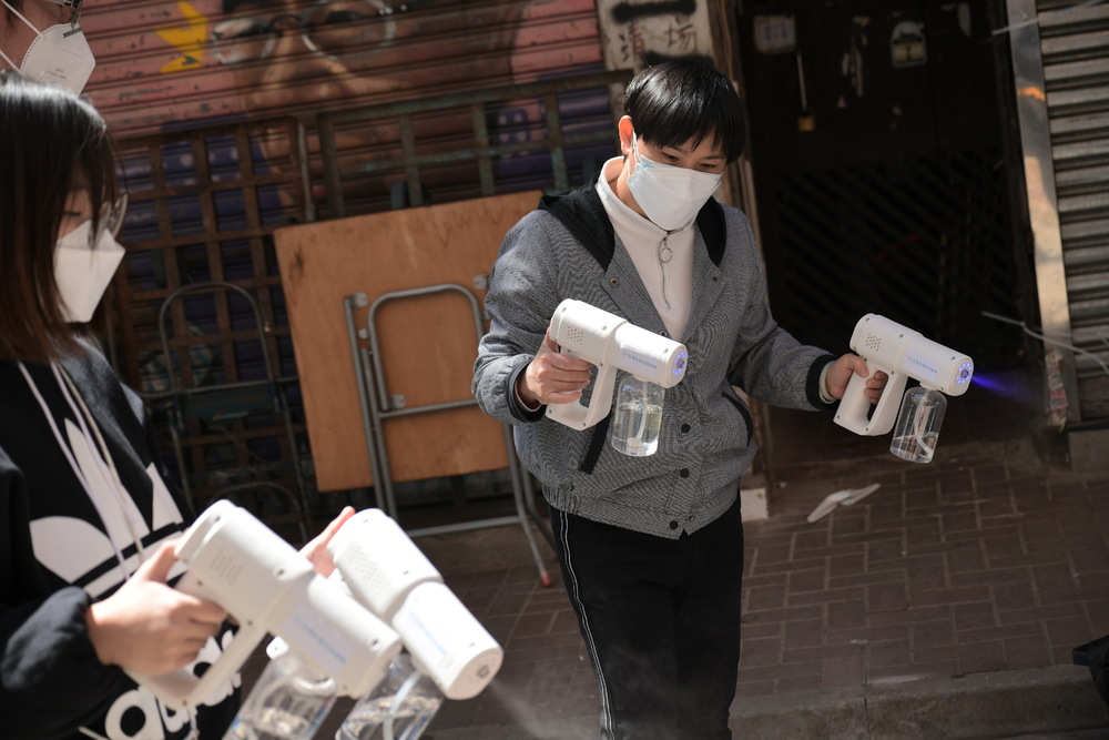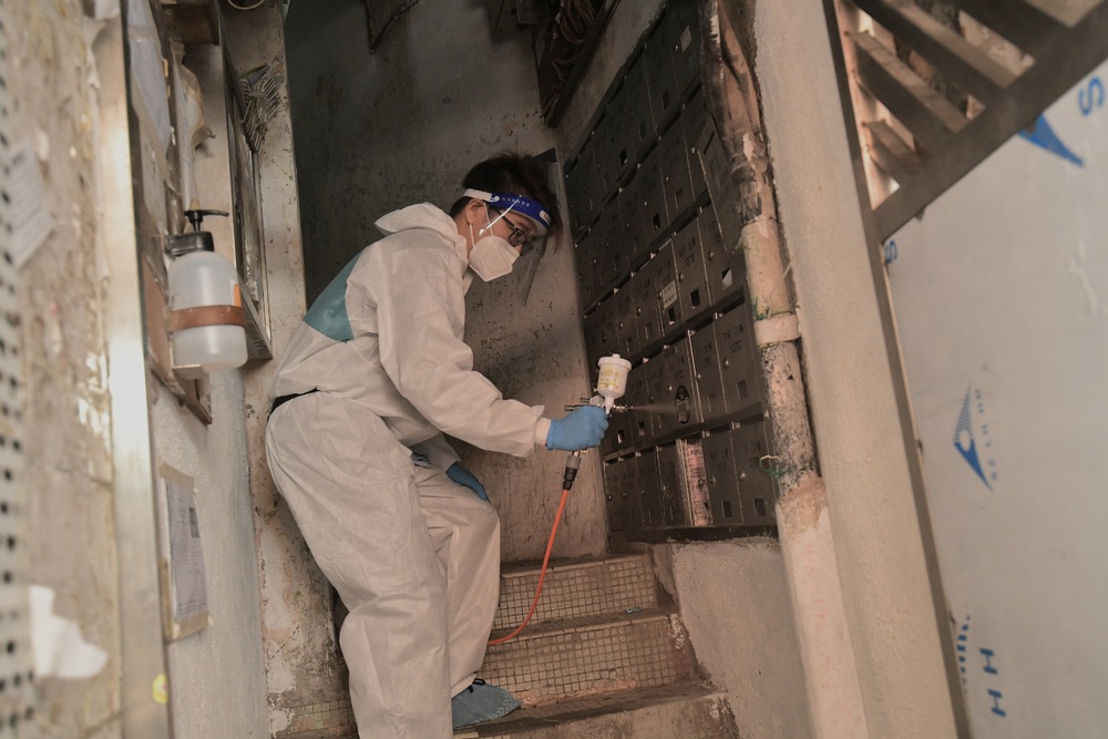 Old buildings are disinfected in a project by an organization called the Hong Kong Community Anti-Coronavirus Link. SING TAO