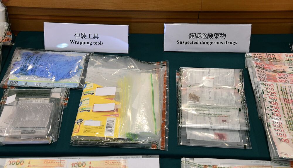 In a follow-up operation on Monday, officers raided three residential units in Sham Shui Po where they seized some 350 grams of heroin worth around HK$360,000. They also found small amounts of ketamine, ecstasy, marijuana and methamphetamine. Officers also seized HK$640,000 in cash along with drug packaging materials.