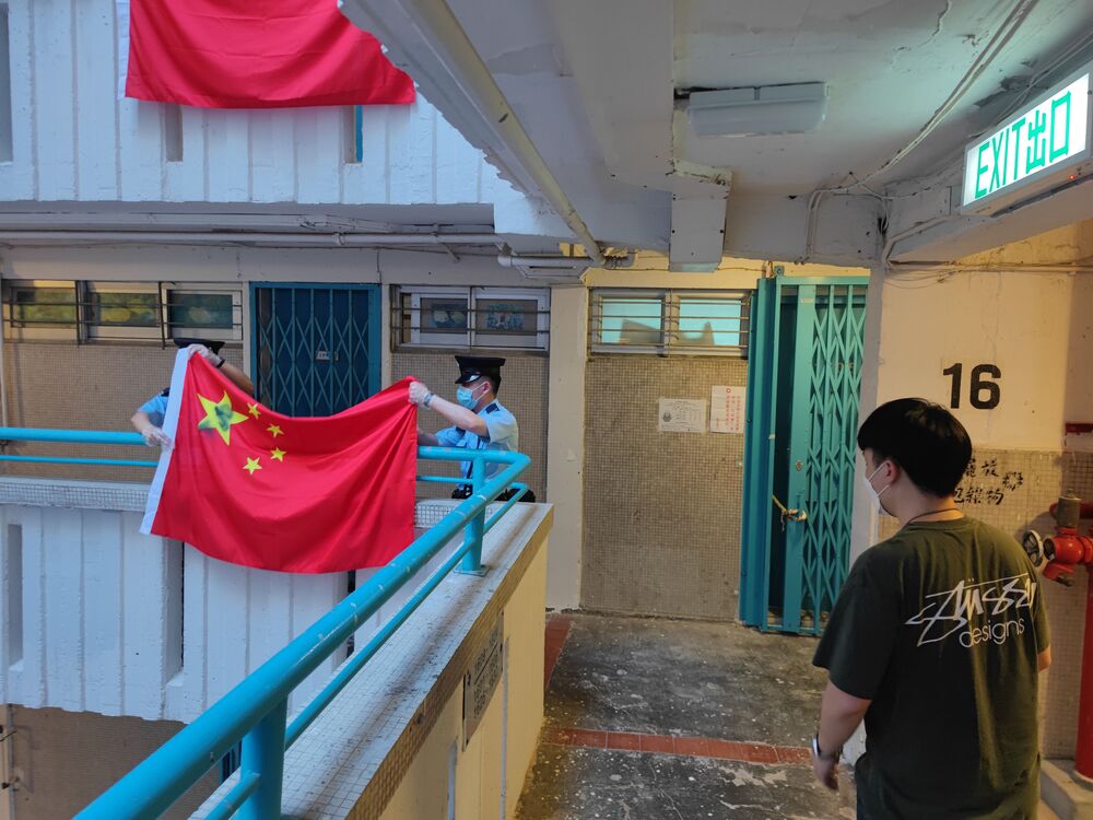 The force said two national flags were stolen and 12 were defiled at Kam Shek House and Lam Shek House of Ping Shek Estate in Kwun Tong. Flags adorn the building for the handover.