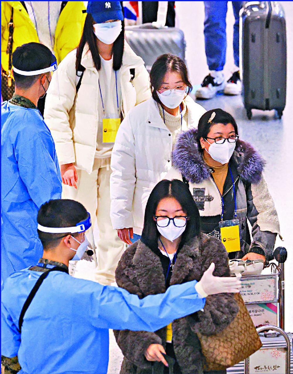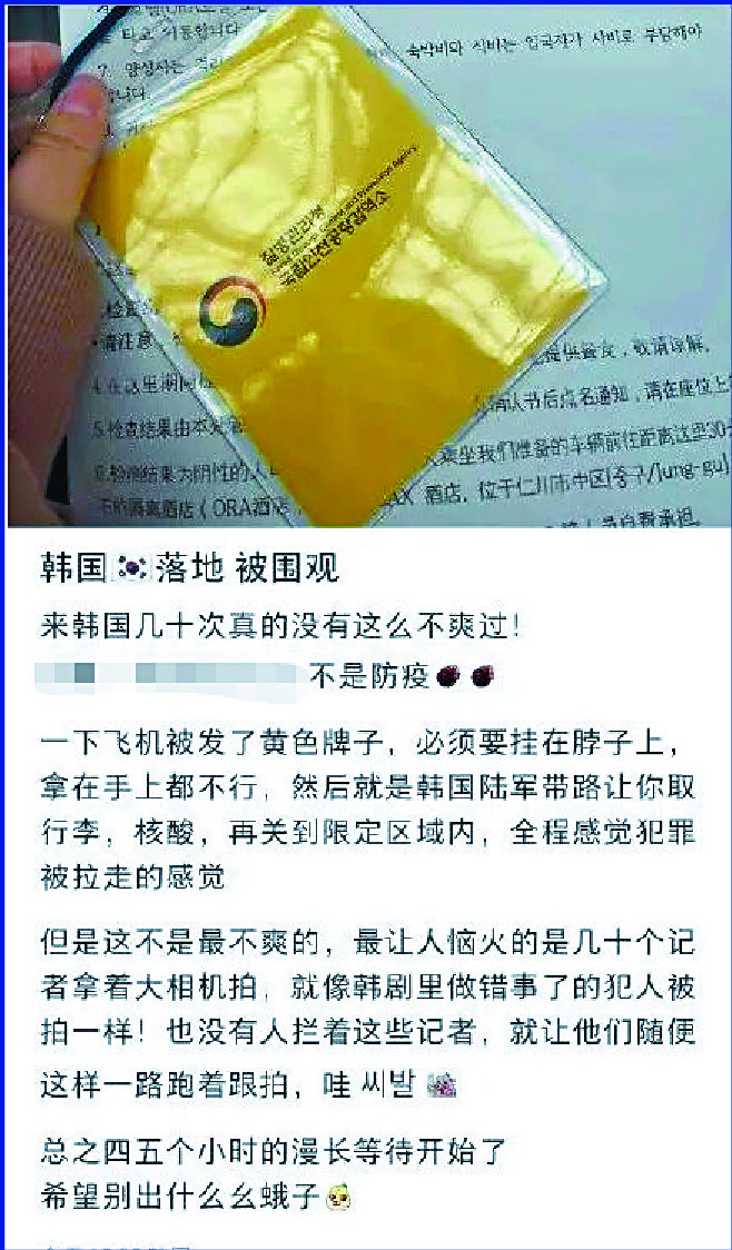 Some mainland travelers complained online about "discriminatory" action by South Korea, including a need to wear a yellow badge until they had obtained a negative result of the arrival PCR test - paid by the travelers - and being subjected to media attention.Similar arrangements were in fact seen when Hong Kong launched one of its quarantine arrangements in September. Overseas arrivals were given a colored badge - green for Hong Kong residents - when awaiting rapid antigen tests at the airport, though they were not made to wear them.