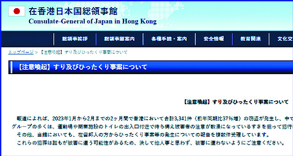 The consulate noted that the number of thefts recorded in Hong Kong from January to February this year increased markedly from the corresponding period last year, which included pickpocketing rising considerably.