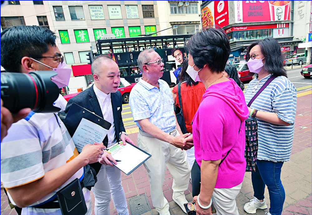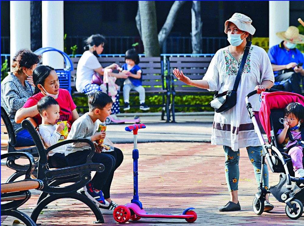 Frank Chan says district councils should focus on serving residents. Right, helpers and their wards at a park and, below, the pro-establishment camp hitting the streets to seek support for electoral change. SING TAO