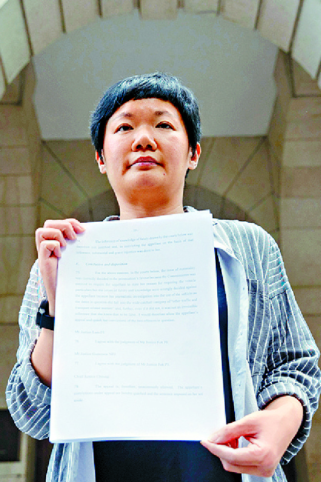 The Court of Final Appeal overturned the conviction, saying "genuine investigative journalism" on whether a car owner has committed a crime should not be excluded from transport-related matters.
