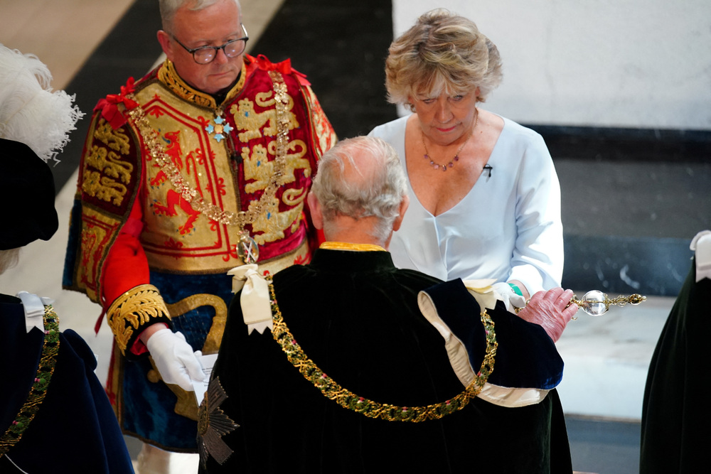 The 74-year-old head of state received the Honours of Scotland – a crown, sceptre and sword of state – at Edinburgh’s St Giles’ Cathedral.