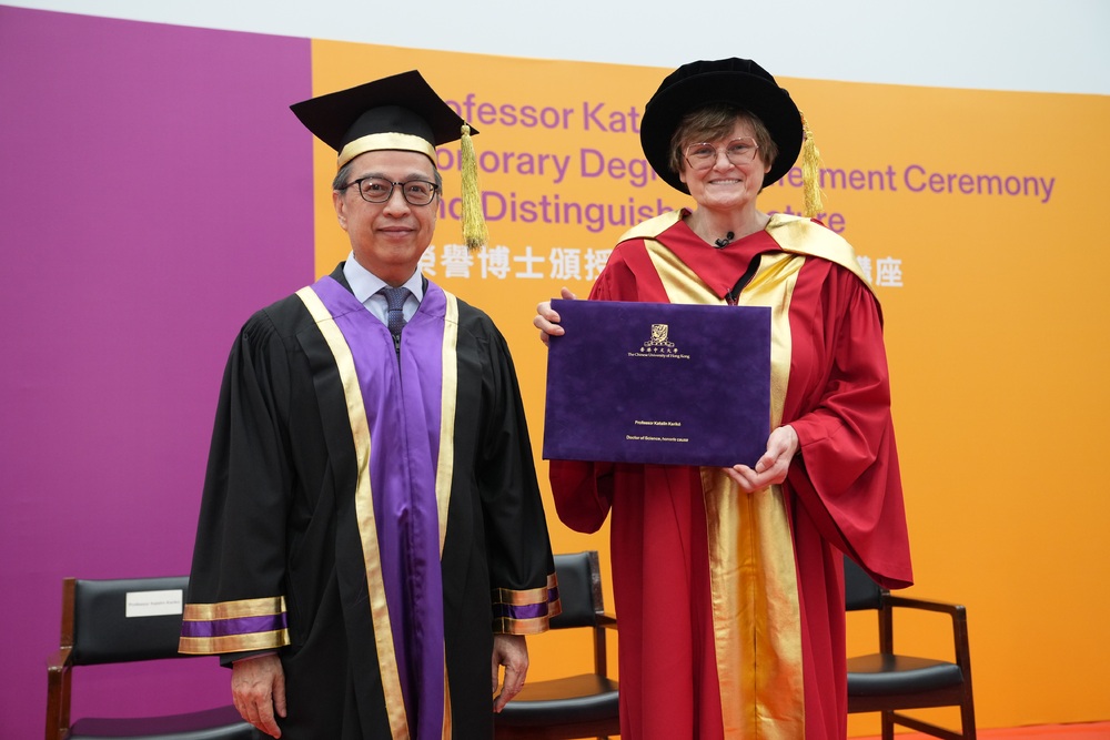 Katalin Kariko receives an honorary doctorate of science from CUHK acting vice chancellor Alan KL Chan.