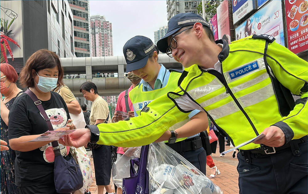 The second phase of activities took place yesterday and will end today. The traffic branch, together with members of the Road Safety Team and Traffic Safety Patrol, are distributing leaflets and souvenirs at 25 locations in Hong Kong to spread the message of road safety.