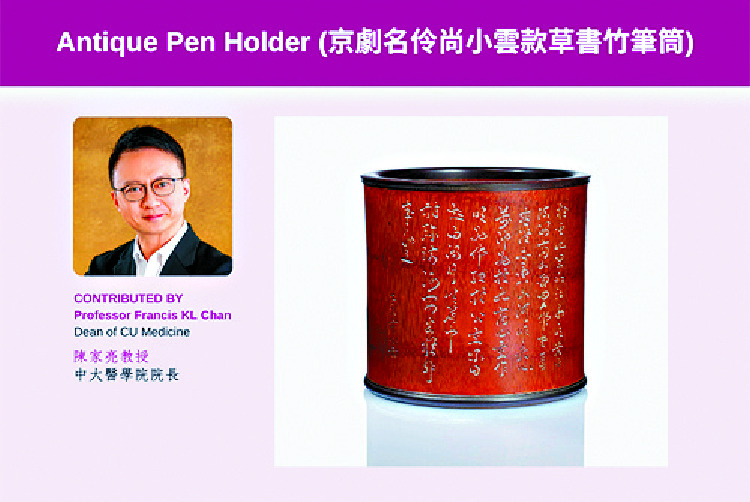 They include Dean Francis Chan Ka-leung, who gave an antique pen holder from his collection; a Chinese painting by associate dean (external affairs) Philip Chiu Wai-yan; a cartoon artwork by alumnus Lucci Lugee Liyeung; a photograph by associate dean (research) Dennis Lo Yuk-ming; a calligraphy work, Bring in the Wine, by associate dean Enders Ng Kwok-wai; a calligraphy featuring an excerpt from Su Shi's Calm The Waves by emeritus professor in the Department of Medicine and Therapeutics, Joseph Sung Jao-yiu; and an artwork, Pearl of the Orient, and an ink pen sketch by Randolph Wong Hung-leung, chief of the division of cardiothoracic surgery.