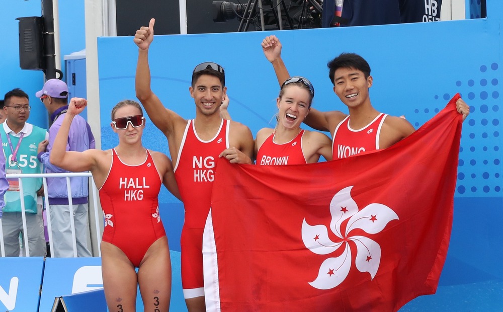 Elsewhere in the Chun'an Jieshou Sports Centre Triathlon Course, the Hong Kong team, consisting of Wong Tsz-to, Bailee Brown, Hardcastle Ng Tai-long and Charlotte Hall, snatched a bronze in triathlon mixed relay.