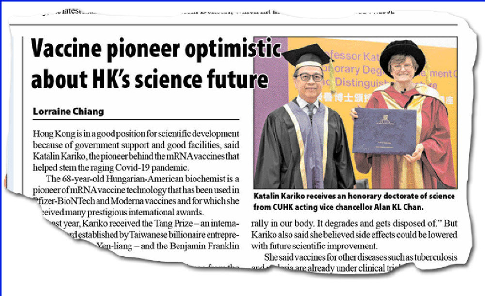 Kariko, who received an honorary doctorate of science from Chinese University in August, also received the Tang Prize - an international award established by Taiwanese billionaire entrepreneur Samuel Yin Yen-liang - and the Benjamin Franklin Medal in Life Science.