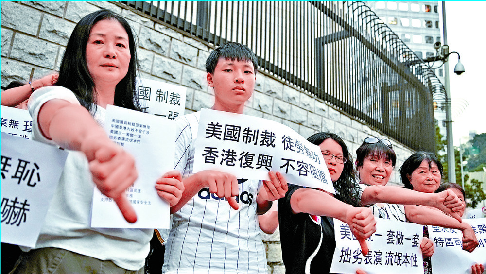 The Hong Kong Federation of Trade Unions and Democratic Alliance for the Betterment and Progress of Hong Kong also protested, with DAB lawmaker Elizabeth Quat Pui-fan describing the sanction as "terrorist behavior."Some 30 people also protested outside the consulate, tearing up the American flag printed on A4 paper in anger.