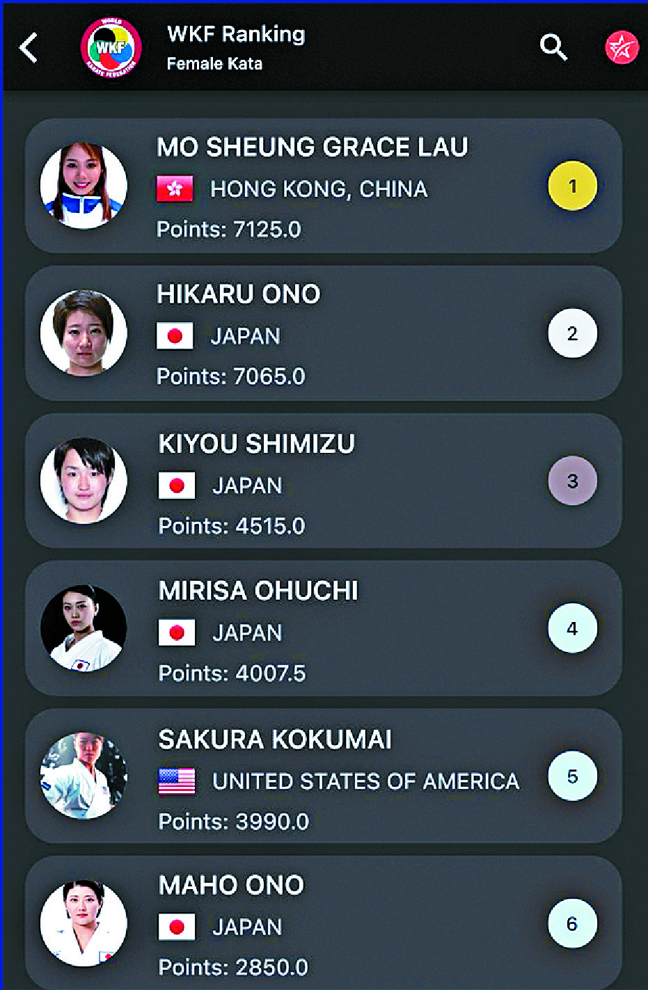The World Karate Federation's rankings released yesterday shows the 32-year-old Lau at the top with 7,125 points after being world No 2 since November 2022.