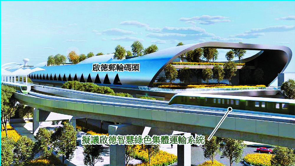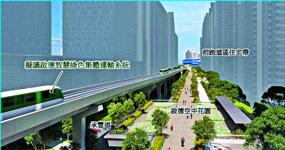 An artist's rendering of the proposed five-stop elevated smart and green mass transit system connecting the Kai Tak Cruise Terminal to the MTR Kai Tak station and surrounding areas.