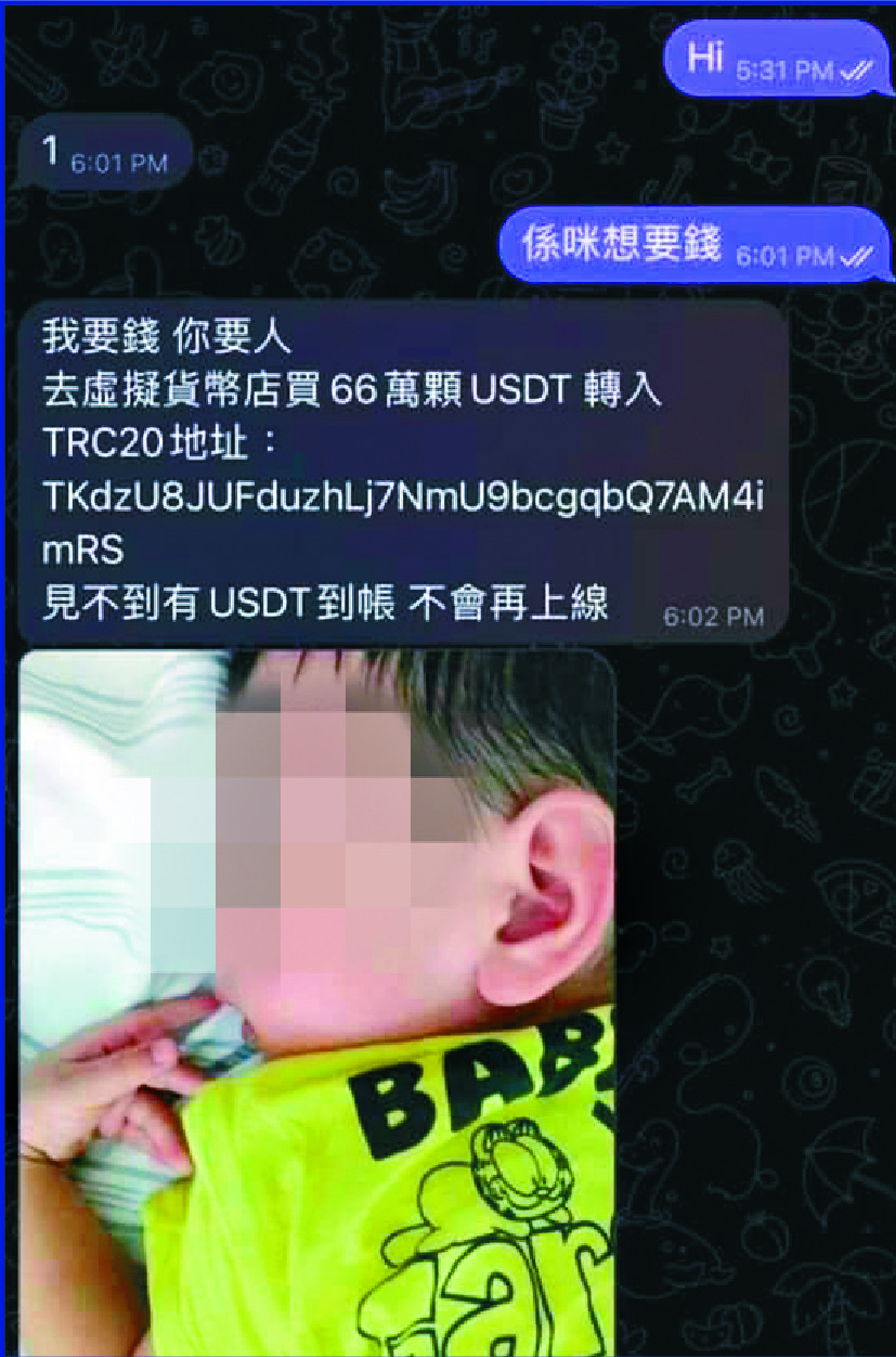 Another screen capture of a Telegram chat box showed the demand of the kidnappers, who wanted US$660,000 (HK$5.15 million) worth of Tether coins and stated: "I will not be online again until the USDT is transferred to the account."The request was sent with a close-up photo of a child sleeping.