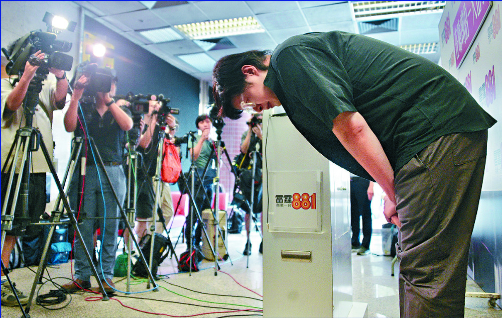 Jay Liu, bowing after speaking on a radio program, says some six steps in making the fermented bean curd are done locally. SING TAO