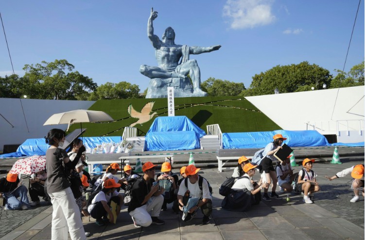 Visitors to the Peace Park in Nagasaki crouch during last week''s earthquake alert. AP