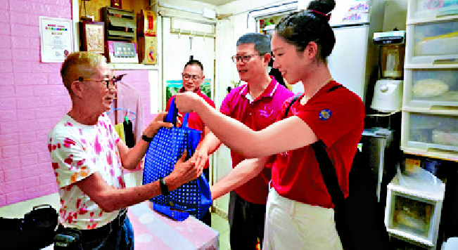 The Hong Kong Jockey Club's team of volunteers, including executive director Dennis Hau Tak-yeung, external affairs manager Freely Cheng Kei and Hong Kong's "queen of swords" Vivian Kong Man-wai, visited elderly singles and couples in Sham Shui Po. Kong also brought along her gold medal as a pleasant surprise.