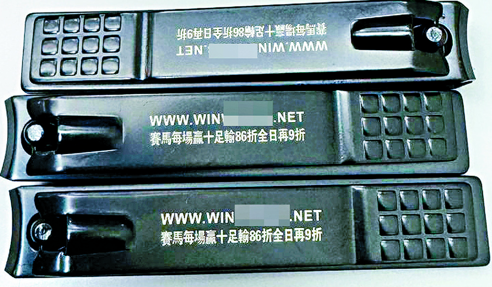 The nail clippers also displayed the website's address.Similar giveaways were distributed at various betting branches on race days, including wet tissue packages outside a betting center in Hung Hom in November.