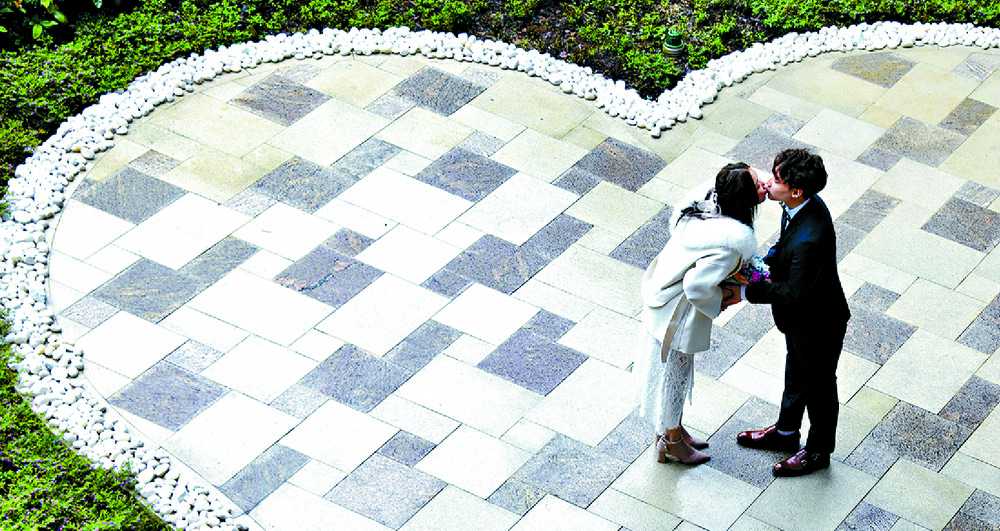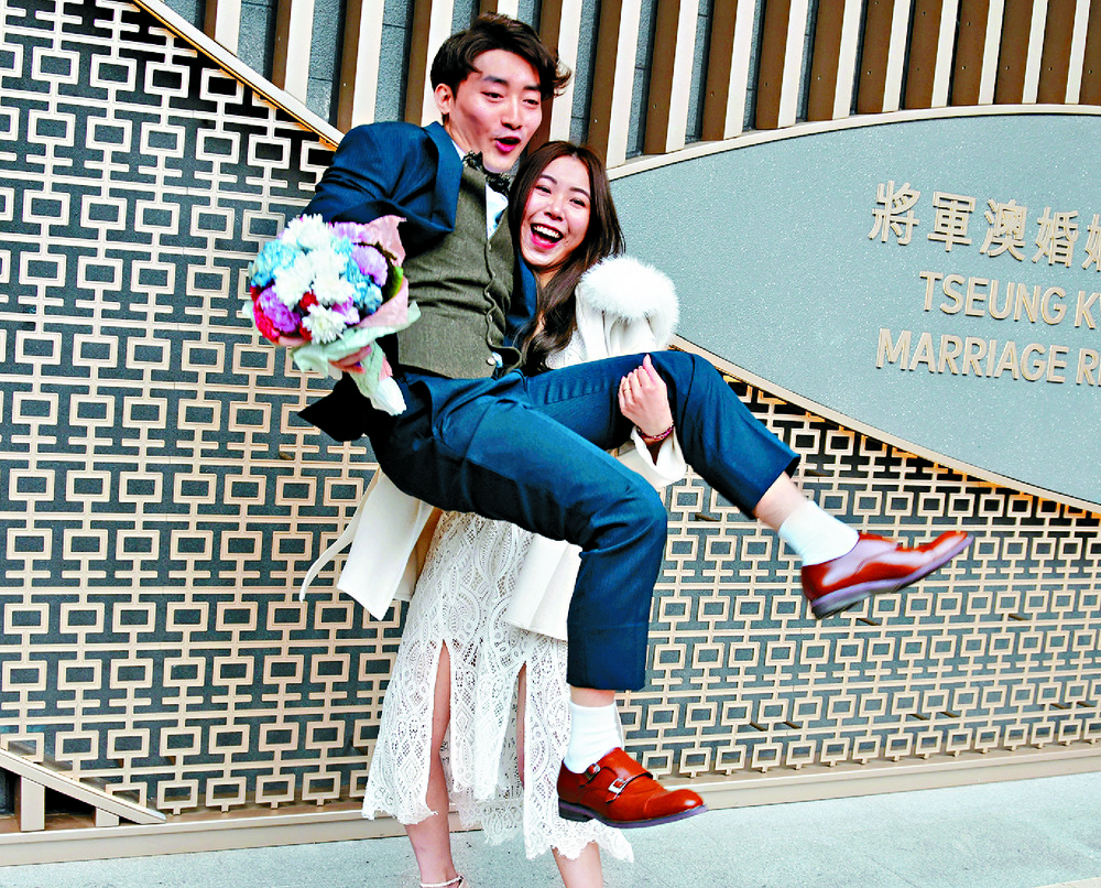 At the Tseung Kwan O marriage registry, all 23 quotas were fully booked. Couples were seen taking photos at its heart-shaped garden despite the rain.