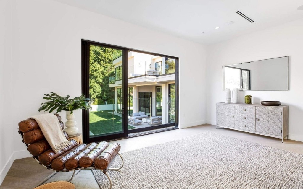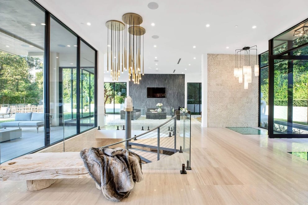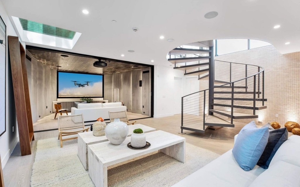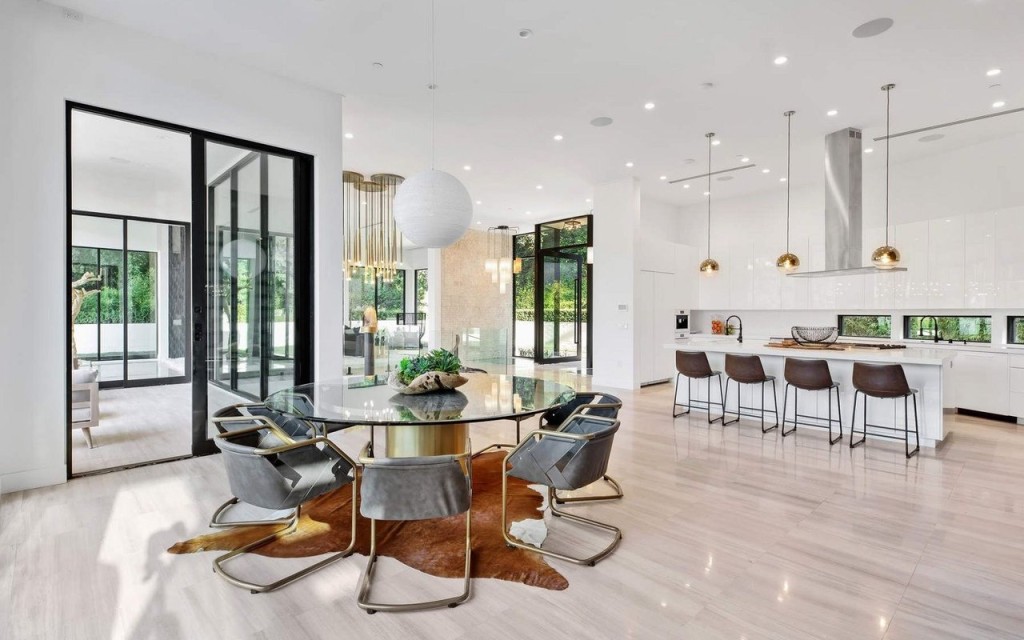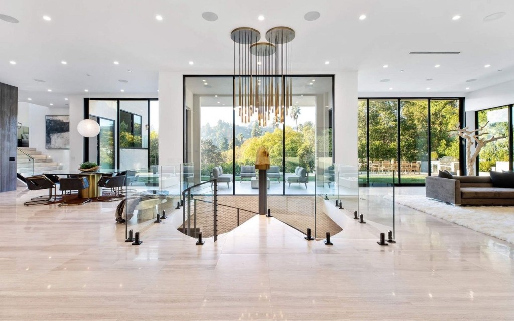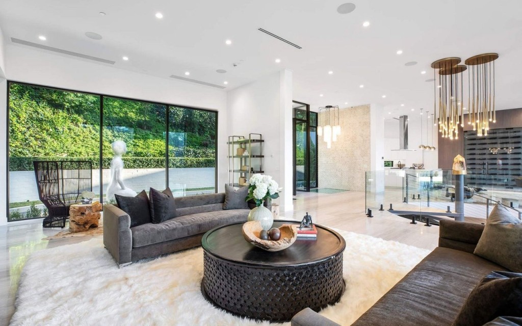 The mansion spans over 7,000 square feet and features a minimalist modern design that is predominantly white, with numerous floor-to-ceiling windows that fill the interior with sunlight.