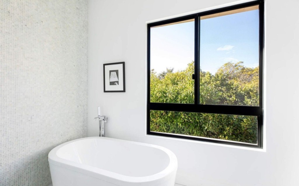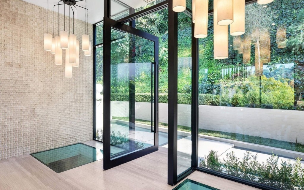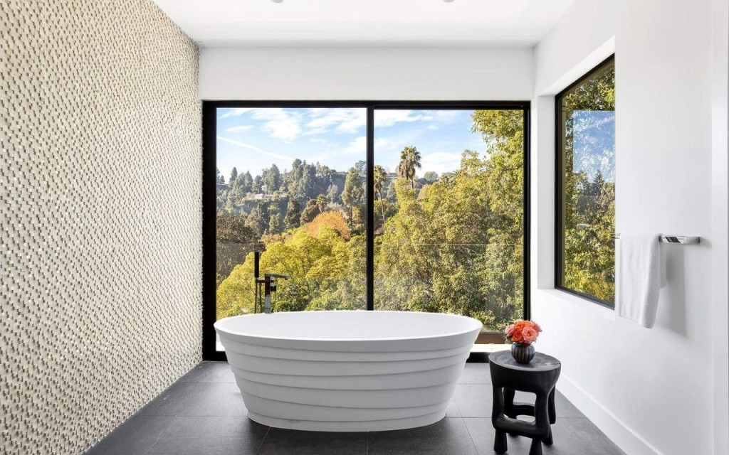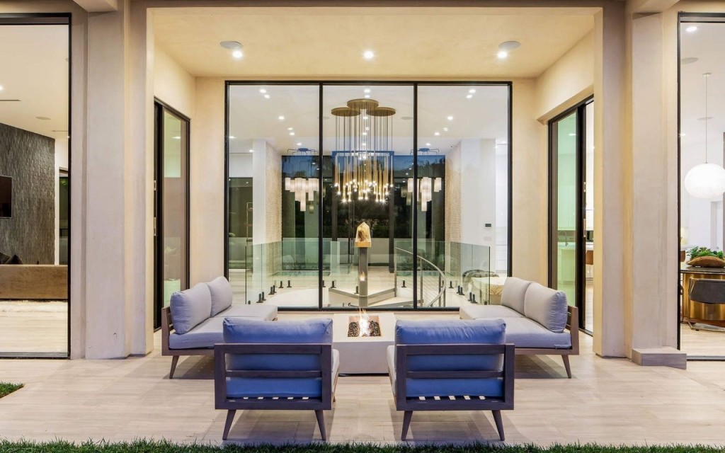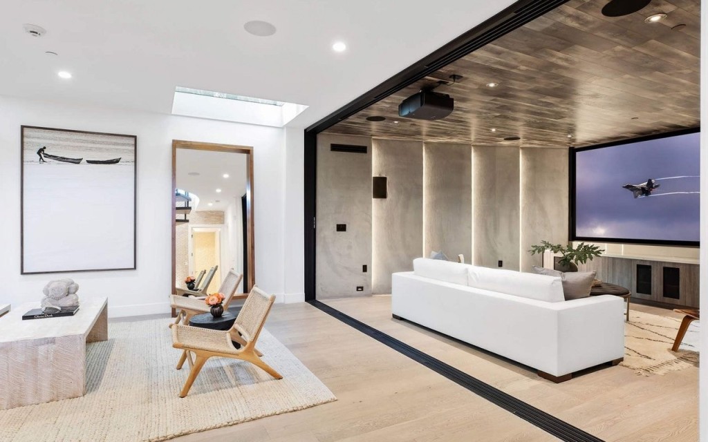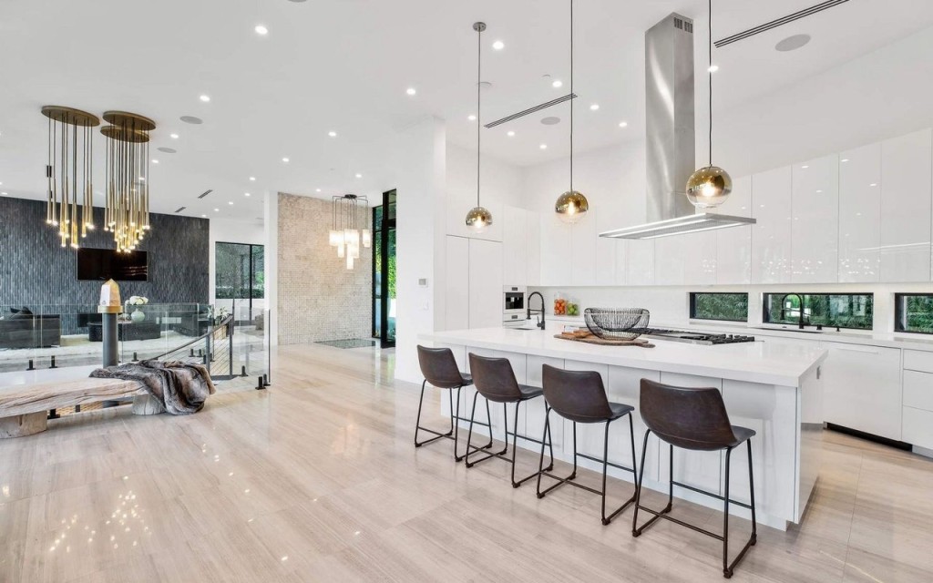 The mansion spans over 7,000 square feet and features a minimalist modern design that is predominantly white, with numerous floor-to-ceiling windows that fill the interior with sunlight.