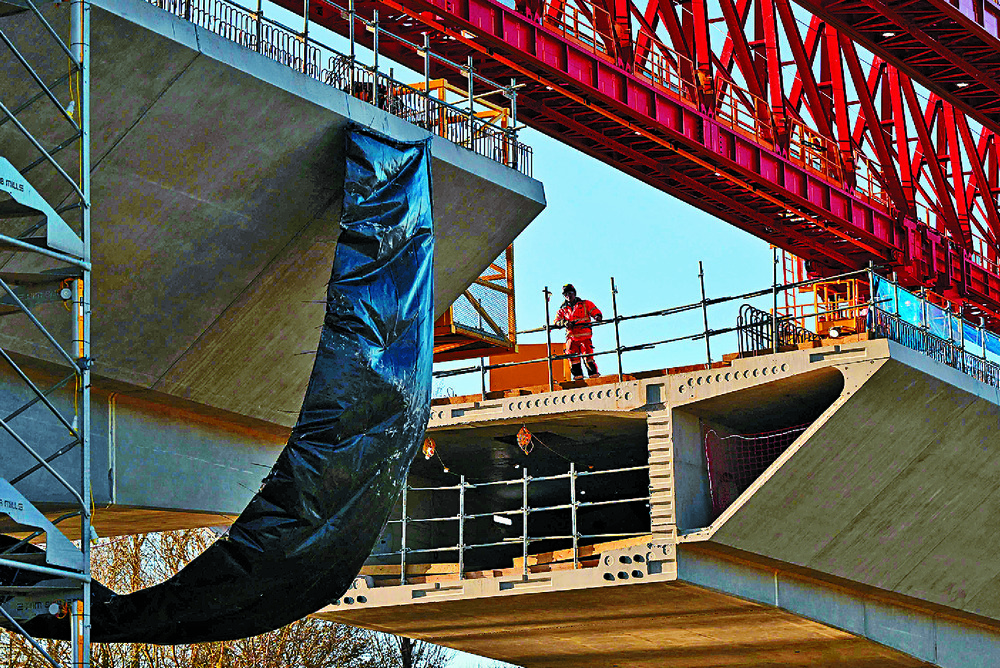 Above the emerging viaduct, a gigantic red launching beam, which resembles a horizontal crane, places prefabricated concrete bridge sections in position one by one. Over 600 of the 1,000 deck segments are now in place.